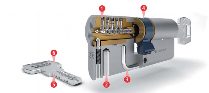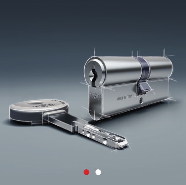 CILINDAR DCK- Visoko sigurnosni cilindar s dupliranim kontrolisanim ključem zaštićenim PIN kodom. Cilindar osigurava visoku otpornost na pokušaje provale, zahvaljujući sljedećim tehničkim karakteristikama: – 15 radijalnih asimetričnih pinova od kaljenog nehrđajućeg čelika i fiksnih pinova za upravljanje valjcima ključeva – 3 ojačana klina protiv bušenja – 5 visoko-otpornih ključeva s mobilnim elementima i AGB patentiranim ergonomskim držačem. Dostupna verzija s duplom funkcijom (istovremeno rade dva ključa).