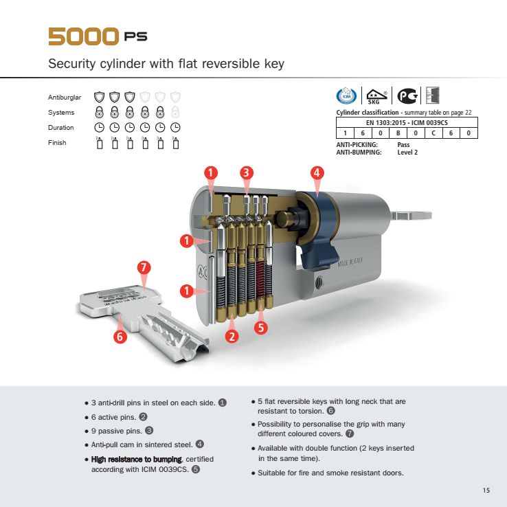 MODEL 5000- Cilindar sa tri pina protiv bušenja. Otpornost na udare. Protivpožarni i protivdimni. Dostupnost duple funkcije (istovremena upotreba dva ključa).